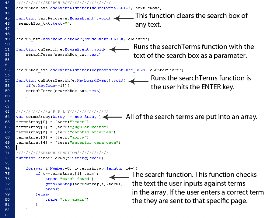 After the wire frame was completed and the design finalized, I finally began the coding for the interactive. I started by adding the functionality to the interactive, adding the main navigation the content for each page. The final touch to the interactive was to add the search engine. The search allows the user to type in word, and jump to that specific page.
